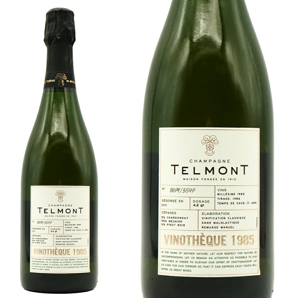 ■商品名テルモン・シャンパーニュ・ヴィノテーク・ミレジム[1985]年・究極限定セラー出し秘蔵酒・テルモン社(ハリウッドスターのレオナルド・ディカプリオも株主)・AOCミレジメ・シャンパーニュ・(シャンパーニュのプロ達が「見つけたら押さえろ!」という合言葉があるほどの世紀のヴィンテージ)ティラージュ1986年&デゴルジュマン2021年・ドサージュ4.2g/L(エクストラ・ブリュット)・セラー貯蔵期間驚異の492ヶ月(41年間)・自然派・750ml・白・辛口・正規品・全生産本数(全世界に)わずか3547本のみ(全品手書きナンバー入り) ■英名Telmont Champagne Vinotheque Extra Brut Millesime 1985 AOC Millesime Champagne ■商品説明希少!最高級ヴィンテージシャンパーニュ辛口愛好家大注目!しかもシャンパーニュのプロ達が「見つけたら押さえろ!」という合言葉があるほどのスーパーグレイトヴィンテージと言われる愛好家垂涎の世紀のヴィンテージ[1985]年もの!シャンパーニュ・オールドヴィンテージ古酒愛好家垂涎の驚異の41年...